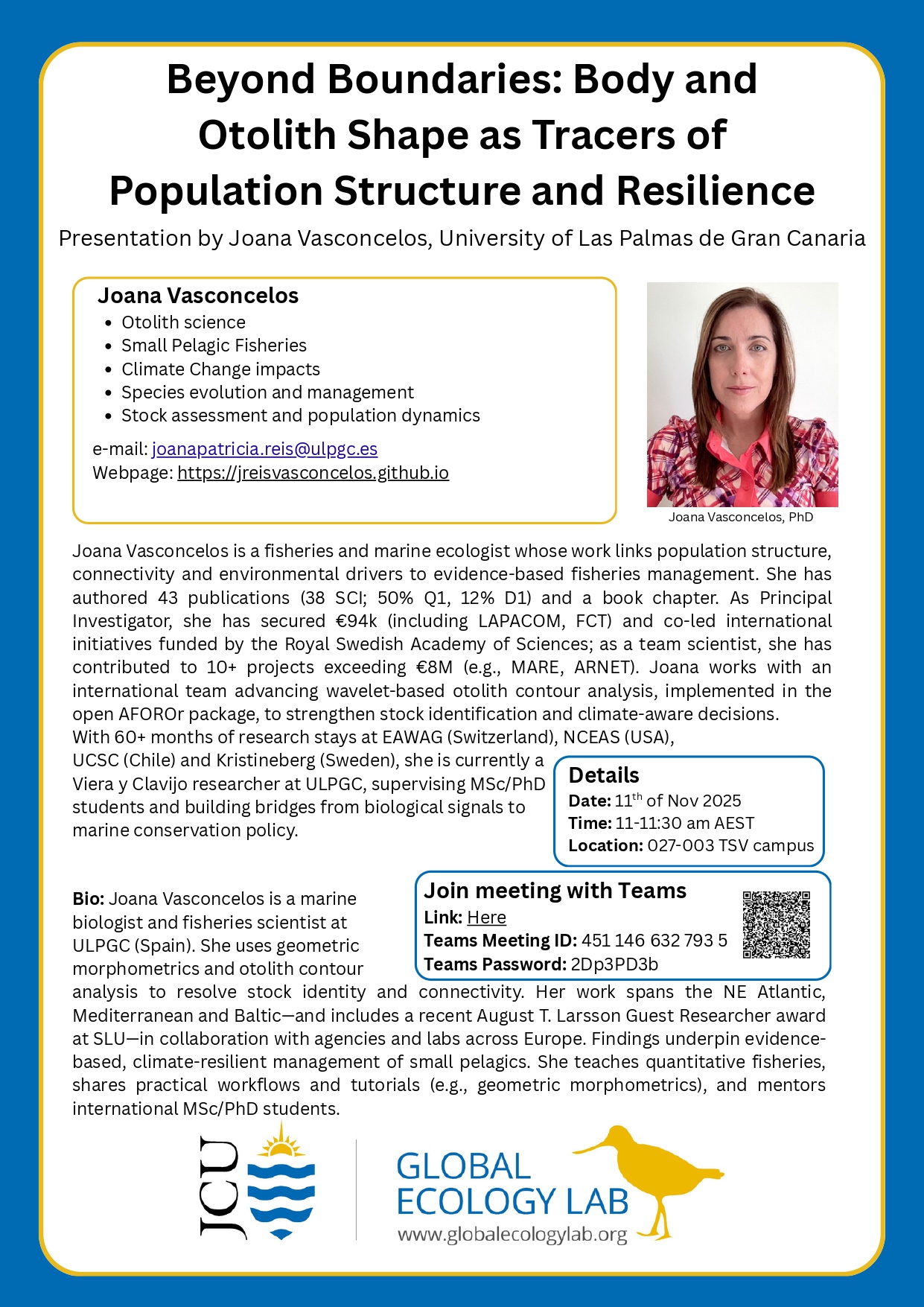 On 11 November 2025 I was invited by Dr. José Sanabria and the Global Ecology Lab at James Cook University (JCU, Townsville, Australia) to give the seminar “Beyond Boundaries: Body and Otolith Shape as Tracers of Population Structure and Resilience”. The talk explored how body shape and otolith contours can be used as natural tracers of population structure, connectivity and resilience in marine fishes, supporting climate-resilient, evidence-based fisheries management. This seminar formed part of my one-week scientific stay at JCU, strengthening ongoing collaborations on otolith-based approaches to stock identification and global change ecology.