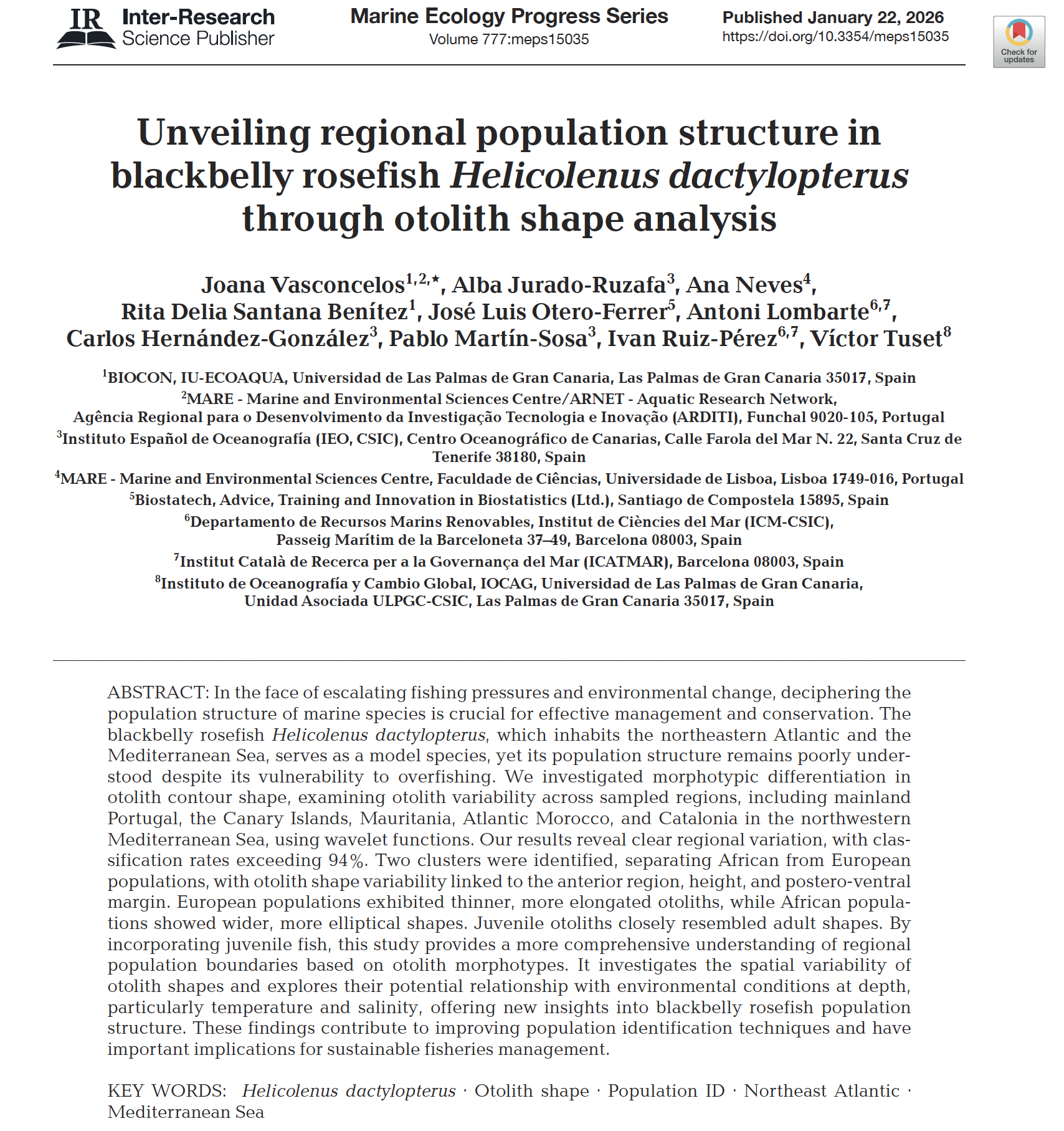 New paper: using wavelet-based otolith contour analysis, we found clear regional differentiation in blackbelly rosefish (Helicolenus dactylopterus) across the NE Atlantic and the NW Mediterranean, with classification rates above 94%.