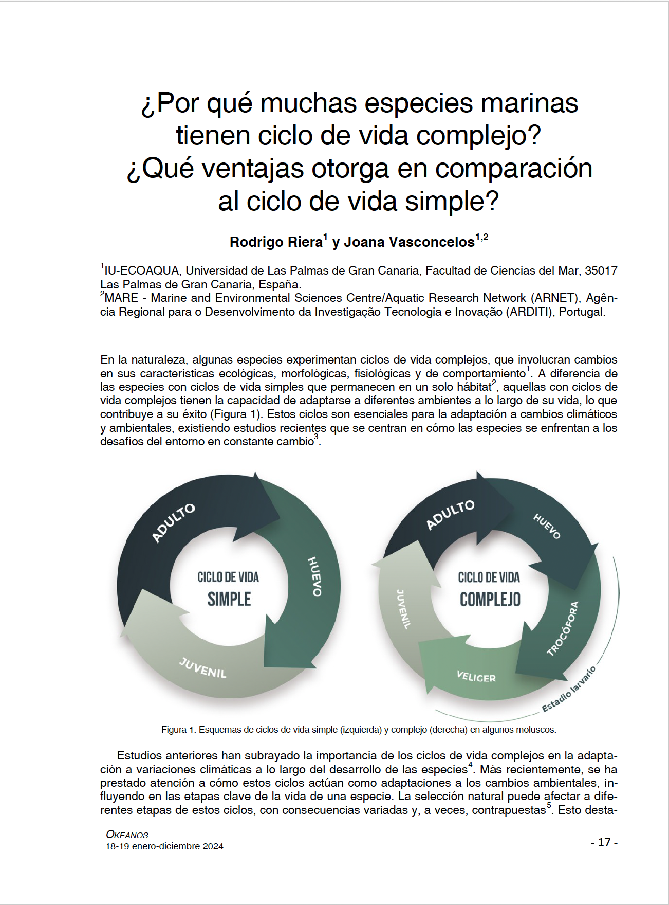 I’m pleased to share two outreach articles co-authored with Rodrigo Riera in the latest double issue of Okeanos – Revista de la Sociedad Atlántica de Oceanógrafos (Nº 18–19, enero–diciembre 2024). The first—“¿Por qué muchas especies marinas tienen ciclo de vida complejo? ¿Qué ventajas otorga en comparación al ciclo de vida simple?”—appears on page 17. The second—“¿Por qué es importante conocer la fecundidad de las especies comerciales? El caso de las lapas comerciales del archipiélago de Madeira.”—on page 35. Both pieces were written within the scope of the project “Metacommunity dynamics of complex life cycle species in exploited ecosystems” (LAPACOM; EXPL/MAT-APL/0262/2021), which examines how dispersal, life-history stages and spatial structure shape population dynamics under exploitation.